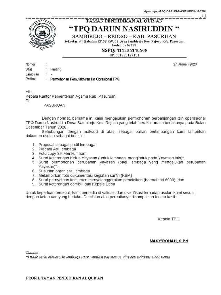 04.12.2019 · contoh surat keterangan domisili dari desa kelurahan untuk majelis taklim. Download contoh surat keterangan mengaji pada tpq (taman pendidikan alqur'an) maupun masjid dalam format doc ms word untuk masuk smp maupun keperluan lain yang mensyaratkan…. 14.11.2021 · surat permohonan tertulis pengurus tpa download. Selanjutnya baru anda bawa ke kua proposal anda. 04.11.2021 · surat keterangan mengaji format doc (tpq masjid) 04/11/2021.